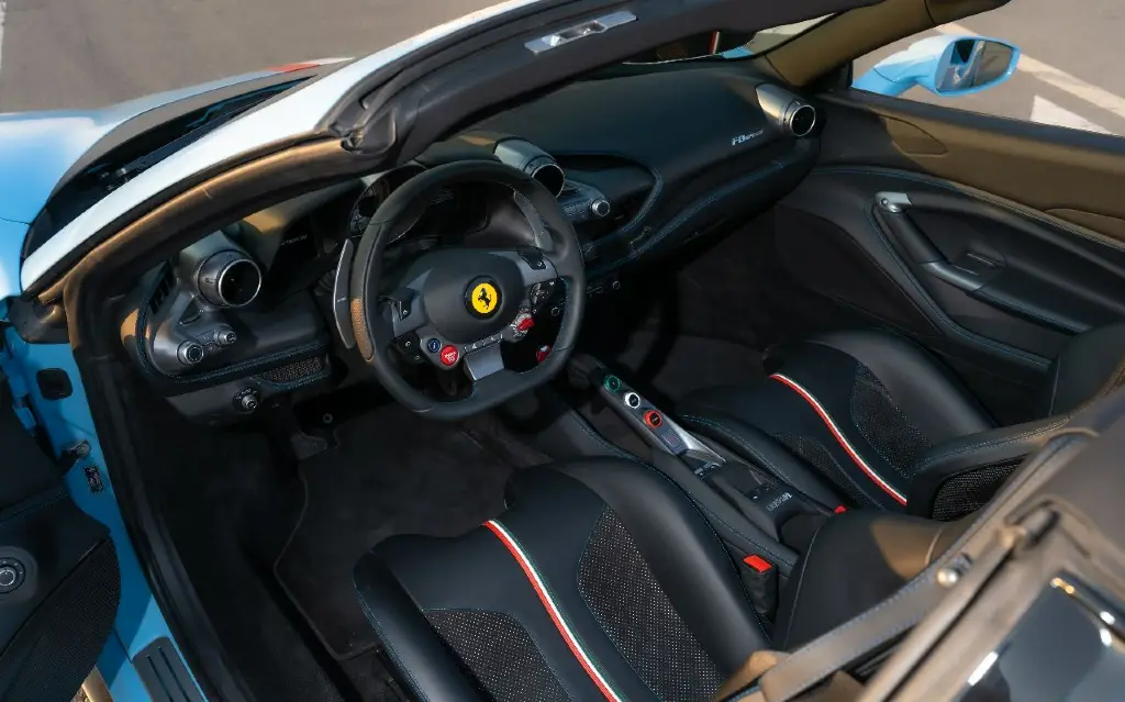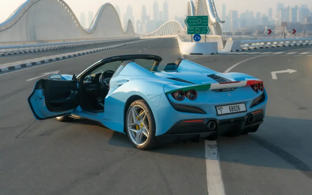 Rent the 2023 Ferrari F8 Tributo Spider in a breathtaking blue finish to experience the ultimate open-air tribute to Maranello's legendary V8 heritage. Often presented in striking shades like Blu Corsa or Blu Pozzi, this mid-engine convertible delivers a monumental 710 horsepower, allowing you to reach 100 km/h in a blistering 2.9 seconds. Whether you are cruising the vibrant shoreline of Jumeirah Beach or navigating the architectural wonders of Downtown Dubai, the F8 Spider’s retractable hardtop transforms your drive into an immersive sensory experience in just 14 seconds, perfectly blending the city's glamorous skyline with the raw, mechanical symphony of a twin-turbocharged engine.